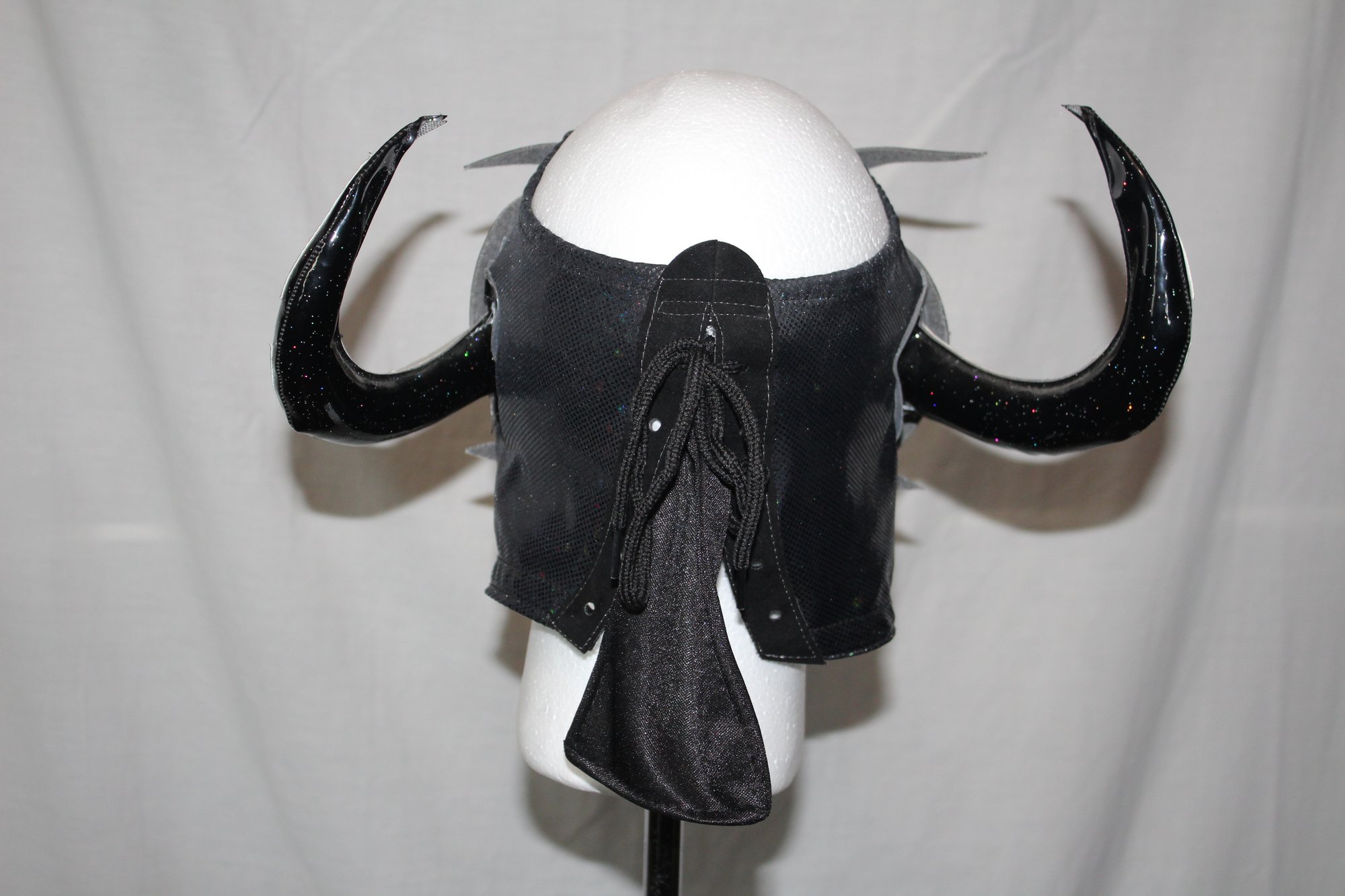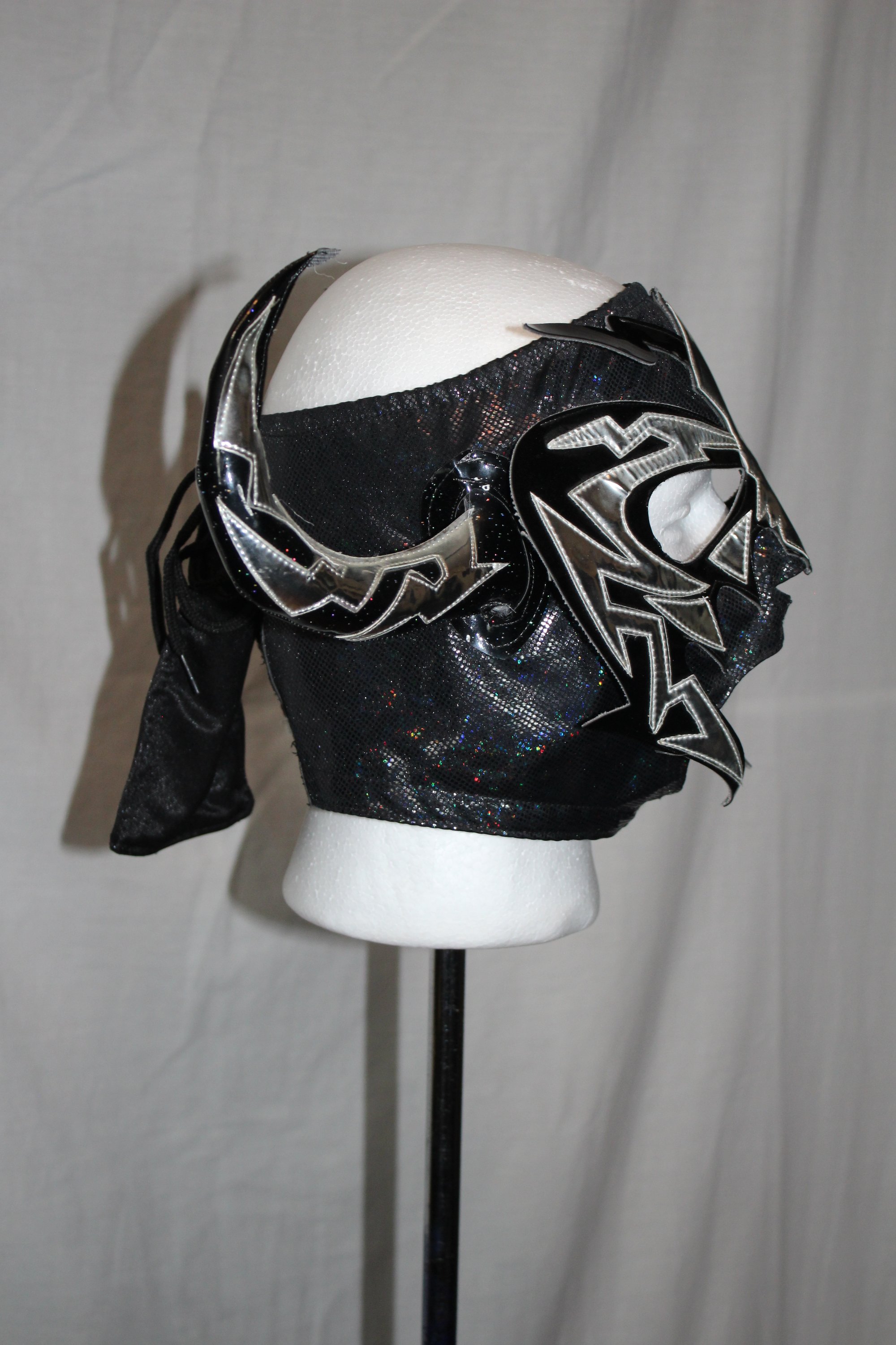Mask features an open top head for letting your hair through, higher quality fabric and a lace up tie on the back side of the mask.